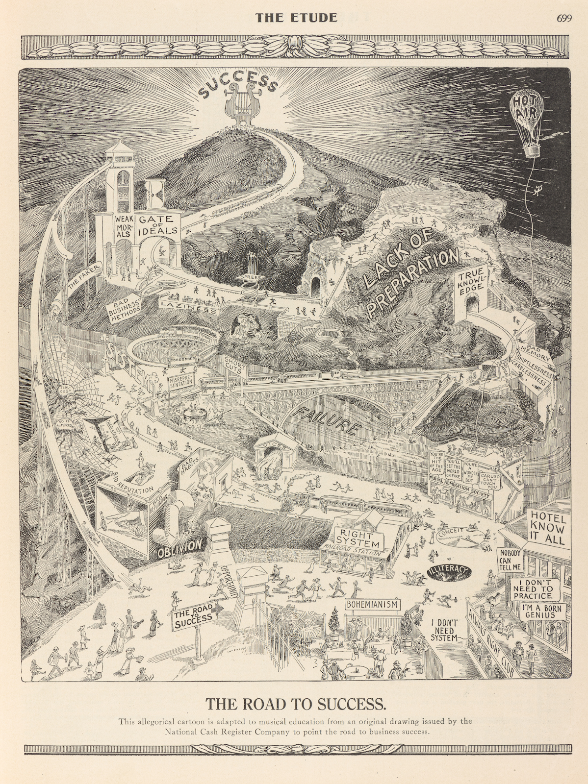 (Subtitle: "This allegorical cartoon is adapted to musical education from an original drawing issued by the National Cash Register Company to point the road to business success.")